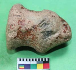 | Description / विवरण | Lid-knob shape stamp with red polish on the surface. It has incised holes at the bottom |
