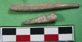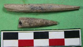 | Description / विवरण | Fragments of two bone points having conical shape .Slightly chipped-off from the surface. Their colour is off-white and surface is smooth. |
