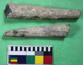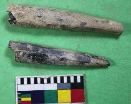 | Description / विवरण | Fragments of two different bone points conical in shape. Its colour is off white and rough surface. |