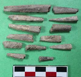 | Description / विवरण | Different size fragments of bone point conical in shape. Its colour is off white and rough surface. |