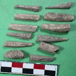 | Description / विवरण | Different size fragments of bone point conical in shape. Its colour is off white and rough surface. |