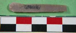 | Description / विवरण | Chert blade showing thin broad parallel sided,one end truncated and sharp cutting edges. Its surface is smooth. |