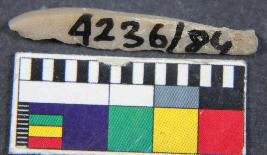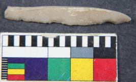 | Description / विवरण | Chert blade showing thin broad parallel sided,one end truncated, tringular in section and sharp cutting edges. Its surface is smooth. |