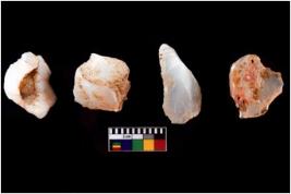 | Description / विवरण | Four worked utilised cores from which blades removed from almost all the sides. |