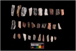 | Description / विवरण | There are n 30 objects out of which 13 are quartz and 17 are chert, out of which 15 can be characterized as blades, there appear a few points as well, and the rest appear as debitage. The microliths are in average working condition and do not appear very sharp. There are singular to multiple flake scars on their surface. A few of them show visible signs of damage and the edges appear blunt. |