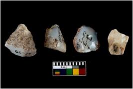 | Description / विवरण | Four worked utilised cores from which blades removed from almost all the sides. |