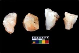| Description / विवरण | Four utilised worked cores with sharp edges. Some of them are tapering at one end. Removal of flakes from few sides. |
