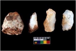 | Description / विवरण | Four utilised worked cores with sharp edges. Some of them are tapering at one end. Removal of flakes from few sides. |