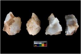 | Description / विवरण | Four utilised worked cores with sharp edges. Some of them are tapering at one end. Removal of flakes from few sides. |