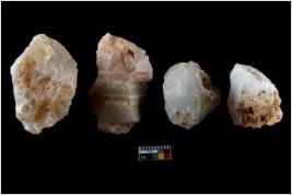 | Description / विवरण | Four utilised worked cores with sharp edges. Some of them are tapering at one end. Removal of flakes from few sides. |
