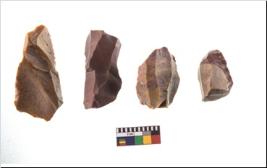 | Description / विवरण | Four utilised worked cores with sharp edges. Flakes removed from almost all the sides. Some are tapering at one end. |