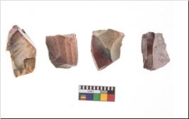 | Description / विवरण | Four utilised worked cores with sharp edges. Flakes removed from almost all the sides. Some are tapering at one end. |