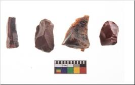 | Description / विवरण | Four utilised worked cores with sharp edges. Flakes removed from almost all the sides. Some are tapering at one end. |