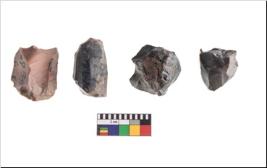 | Description / विवरण | Four utilised worked cores with sharp edges. Flakes removed from almost all the sides. Some are tapering at one end. |
