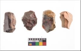 | Description / विवरण | Four utilised worked cores with sharp edges. Flakes removed from almost all the sides. Some are tapering at one end. |