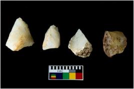 | Description / विवरण | Four worked utilised cores. Flakes removed from few sides. Most of them are uneven and few are tapering at one end. |