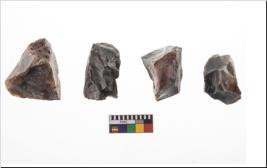 | Description / विवरण | Four utilised worked cores with sharp edges. Flakes removed from almost all the sides. Some are tapering at one end. |