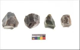 | Description / विवरण | Four utilised worked cores with sharp edges. Flakes removed from almost all the sides. Some are tapering at one end. |