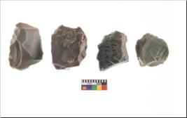 | Description / विवरण | Four utilised worked cores with sharp edges. Flakes removed from almost all the sides. Some are tapering at one end. |