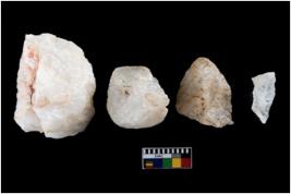 | Description / विवरण | A specimen of a fluted core having very few fluted marks before removing of blades form it. It is roughly rounded in shape and white in colour. |