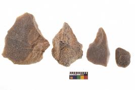 | Description / विवरण | There are n-4 of utilized flake cores. There are multidirectional irregular dominant scar pattern on both dorsal and ventral face of the cores. Some of them bulge of percussion and some are flat flake cores. |