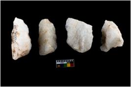 | Description / विवरण | A specimen of a fluted core having very few fluted marks before removing of blades form it. It is roughly rounded in shape and white in colour. |