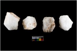 | Description / विवरण | A specimen of a fluted core having very few fluted marks before removing of blades form it. It is roughly rounded in shape and white in colour. |
