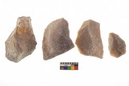 | Description / विवरण | There are n-4 of utilized flake cores. There are multidirectional irregular dominant scar pattern on both dorsal and ventral face of the cores. Some of them bulge of percussion and some are flat flake cores. |