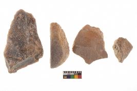 | Description / विवरण | There are n-4 of utilized flake cores. There are multidirectional irregular dominant scar pattern on both dorsal and ventral face of the cores. Some of them bulge of percussion and some are flat flake cores. |