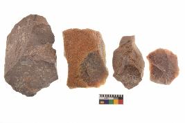 | Description / विवरण | There are n-4 of utilized flake cores. There are multidirectional irregular dominant scar pattern on both dorsal and ventral face of the cores. Some of them bulge of percussion and some are flat flake cores. |