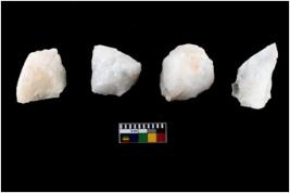 | Description / विवरण | A specimen of a fluted core having very few fluted marks before removing of blades form it. It is roughly rounded in shape and white in colour. |