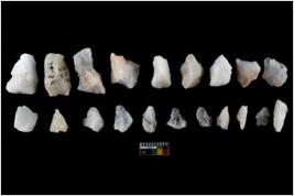| Description / विवरण | There are n-20 of intact flake cores made up of Quartz. Some of them have bulge of percussion and some are flat flakes. |