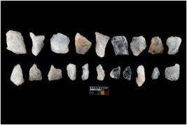 | Description / विवरण | There are n-20 of intact flake cores made up of Quartz. Some of them have bulge of percussion and some are flat flakes. |