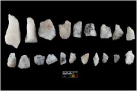 | Description / विवरण | There are n-20 of intact flake cores made up of Quartz. Some of them have bulge of percussion and some are flat flakes. |