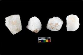 | Description / विवरण | A specimen of a fluted core having very few fluted marks before removing of blades form it. It is roughly rounded in shape and white in colour. |