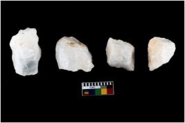 | Description / विवरण | A specimen of a fluted core having very few fluted marks before removing of blades form it. It is roughly rounded in shape and white in colour. |