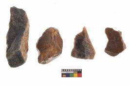 | Description / विवरण | There are n-4 of utilized flake cores. There are multidirectional irregular dominant scar pattern on both dorsal and ventral face of the cores. Some of them bulge of percussion and some are flat flake cores. |