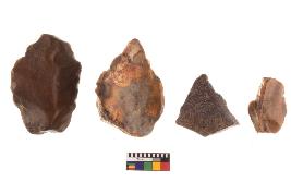 | Description / विवरण | There are n-4 of utilized flake cores. There are multidirectional irregular dominant scar pattern on both dorsal and ventral face of the cores. Some of them bulge of percussion and some are flat flake cores. |