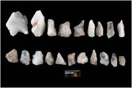 | Description / विवरण | There are n-20 of intact flake cores made up of Quartz. Some of them have bulge of percussion and some are flat flakes. |