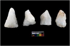 | Description / विवरण | A specimen of a fluted core having several broad fluted marks indicating the detached blades from it |