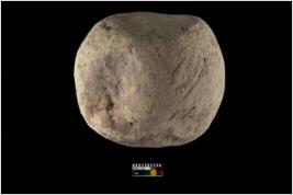 | Description / विवरण | A complete spacimen of a large hammerstone made of quartz, it is irregularly circular , Battered surface, |