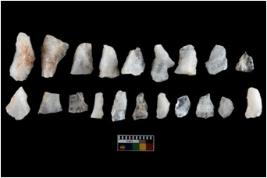 | Description / विवरण | There are n-20 of intact flake cores made up of Quartz. Some of them have bulge of percussion and some are flat flakes. |