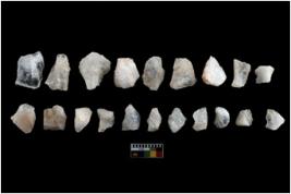| Description / विवरण | There are n-20 of intact flake cores made up of Quartz. Some of them have bulge of percussion and some are flat flakes. |
