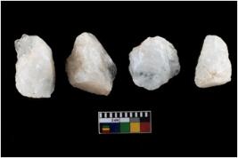 | Description / विवरण | A specimen of a fluted core having few fluted marks before removing of blades form it. It is roughly rounded in shape and white in colour. |