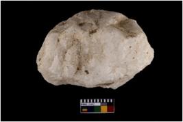 | Description / विवरण | A partially broken specimen of hammerstone made of quartz , It is oval like in shape with, Battered periphery |