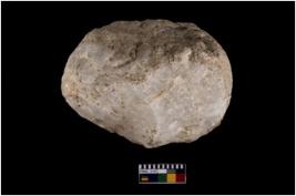 | Description / विवरण | A partially broken specimen of hammerstone made of quartz, It is irregularly circular with battered surface with calcrit formation on it |