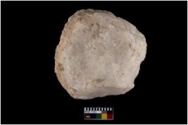 | Description / विवरण | A partially broken specimen of a round shaped hammerstone made of quartz, it is with rough surface showing in the form of an edge . |