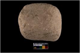 | Description / विवरण | A partially broken specimen of hammerstone made of sandstone, Roughly oval in shape, It has smooth and slightly battered surface |