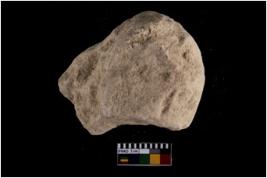 | Description / विवरण | A partially broken specimen of muller made of sandstone, Portion of holding end, It has smooth bottom surface which is thinned due to use and rough upper surface. |