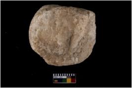 | Description / विवरण | A complete specimen of a hammerstone made of quartz, It is irregularly circular in shape with battered periphery |